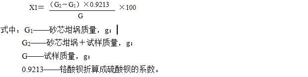 鋇含量的測定采用硫酸鋇重量法。即將試樣與碳酸鈉和碳酸鉀的混合物在高溫下熔溶,硫酸鋇轉(zhuǎn)化成碳酸鋇,用鹽酸將碳酸鋇溶解生成氯化鋇,然后用硫按鋇重量法測定。操作方法:精密稱取本品約0.6g,置鉑金坩堝中,加入無水碳酸鈉10g,混勻,熾灼至熔融,繼續(xù)加熱30分鐘,放冷,將坩堝放入400ml燒杯中,加水250ml,用玻棒攪拌,加熱至熔融物從坩堝中洗脫。將坩堝移出燒杯,用水洗凈,洗液并入燒杯中,繼續(xù)用6mol/L乙酸溶液2ml沖洗坩堝內(nèi)部,然后用水沖洗,洗液合并于燒杯中。加熱并攪拌直至熔融物崩解,燒杯至冰浴中冷卻,至沉淀堅硬且上層液體澄清,將上清液傾出,濾過,小心將細小沉淀轉(zhuǎn)移至濾紙上,用冷碳酸鈉溶液(1→50)沖洗燒杯中內(nèi)容物2次,每次約10ml,攪拌;如上法,繼續(xù)將上清液通過同一濾紙,濾過,小心將細小沉淀轉(zhuǎn)移至濾紙上,然后,將盛有大塊碳酸鋇沉淀的燒杯置于漏斗下,用3mol/L鹽酸溶液洗滌濾紙5次,每次1ml,然后用水洗凈(注:溶液可能呈微渾濁)。加水100ml、鹽酸5ml、乙酸銨溶液(2→5)10ml、重鉻酸鉀溶液(1→10)25ml與尿素10g,用表面皿覆蓋,于80℃~85℃加熱16小時,趁熱經(jīng)已干燥至恒重的垂熔坩堝濾過,轉(zhuǎn)移所有的沉淀,沉淀用重鉻酸鉀溶液(1→200)洗滌,最后用水約20ml洗滌,于105℃干燥2小時,放冷,稱重,所得沉淀物重量與0.9213相乘即為硫酸鋇重量。
